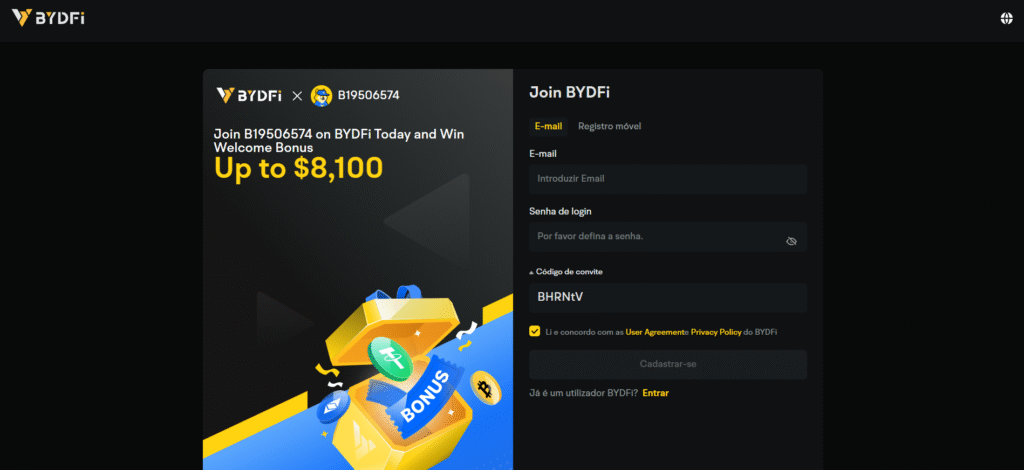 Ao usar o Código de Convite BYDFi (BHRNtV) durante o processo de registro, os usuários podem acessar recompensas maiores, dando-lhes um início vantajoso na sua jornada de criptomoedas.