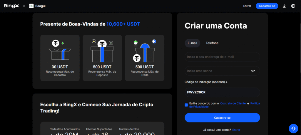 Veja o guia completo passo a passo para se registrar na BingX e ativar suas recompensas: