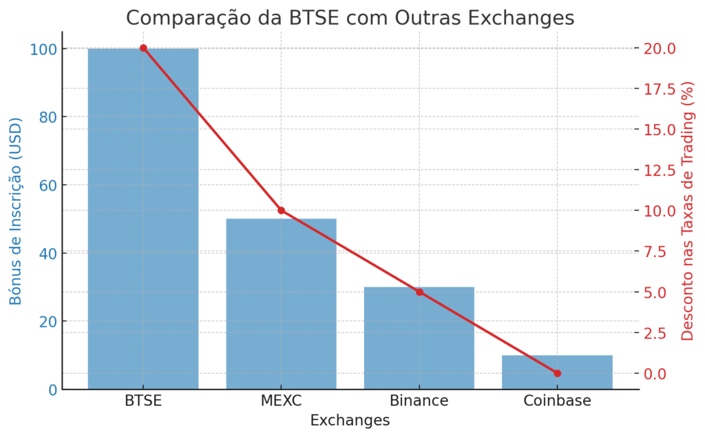 Aqui está o gráfico em português, mostrando a comparação entre a BTSE e outras exchanges em termos de bónus de inscrição (USD) e desconto nas taxas de trading (%).